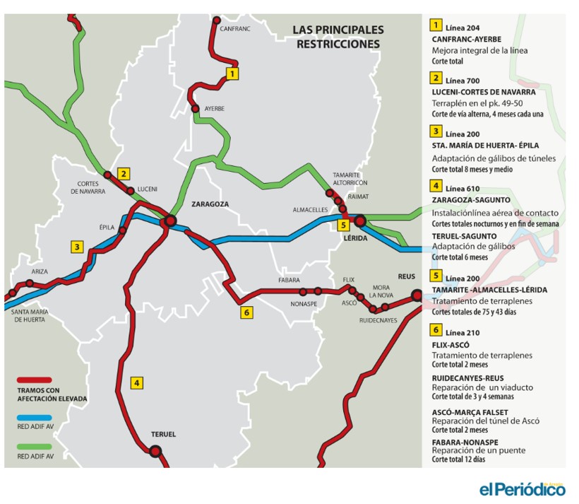 Los usuarios del ferrocarril en Aragón, tanto las empresas que mueven mercancías como los viajeros que utlizan las líneas convencionales, sufrirán un 2025 de cortes de varios meses en varias de las vías que circulan por la comunidad. Los principales damnificados serán los usuarios de las líneas Zaragoza-Madrid (ocho meses y medio sin que pase un solo tren), Zaragoza-Logroño (cuatro meses en cada una de las dos vías en el tramo entre Luceni y Cortes), Teruel-Sagunto (todo el segundo semestre de 2025).