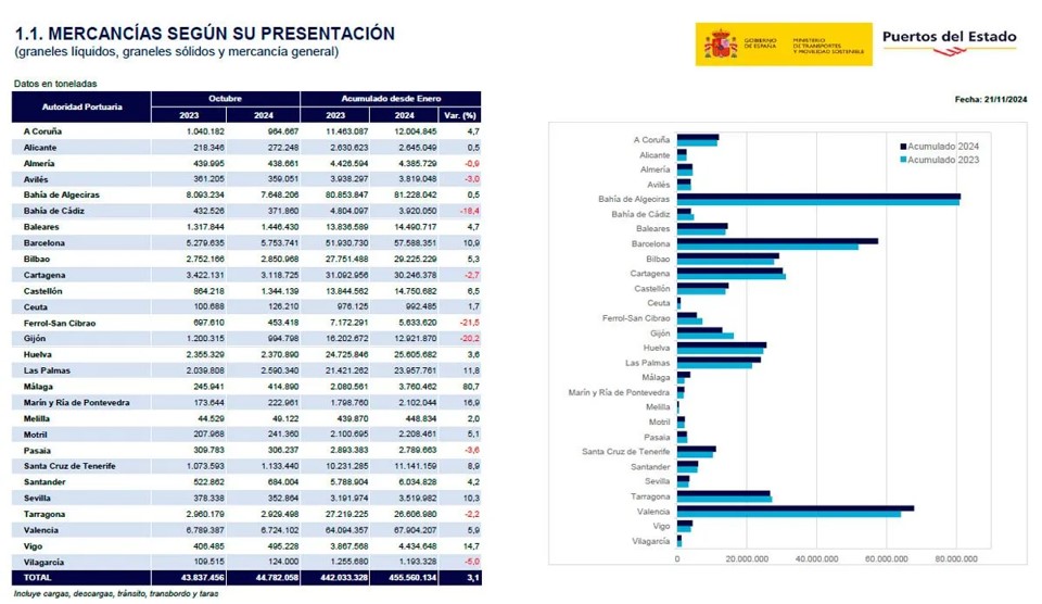 Los puertos españoles movieron entre enero y octubre de 2024 un total de 468.399.486 toneladas, lo que representa un incremento del 3% respecto al mismo periodo del año anterior, en línea con los datos registrados durante lo que va de año, efecto de la situación coyuntural mundial.