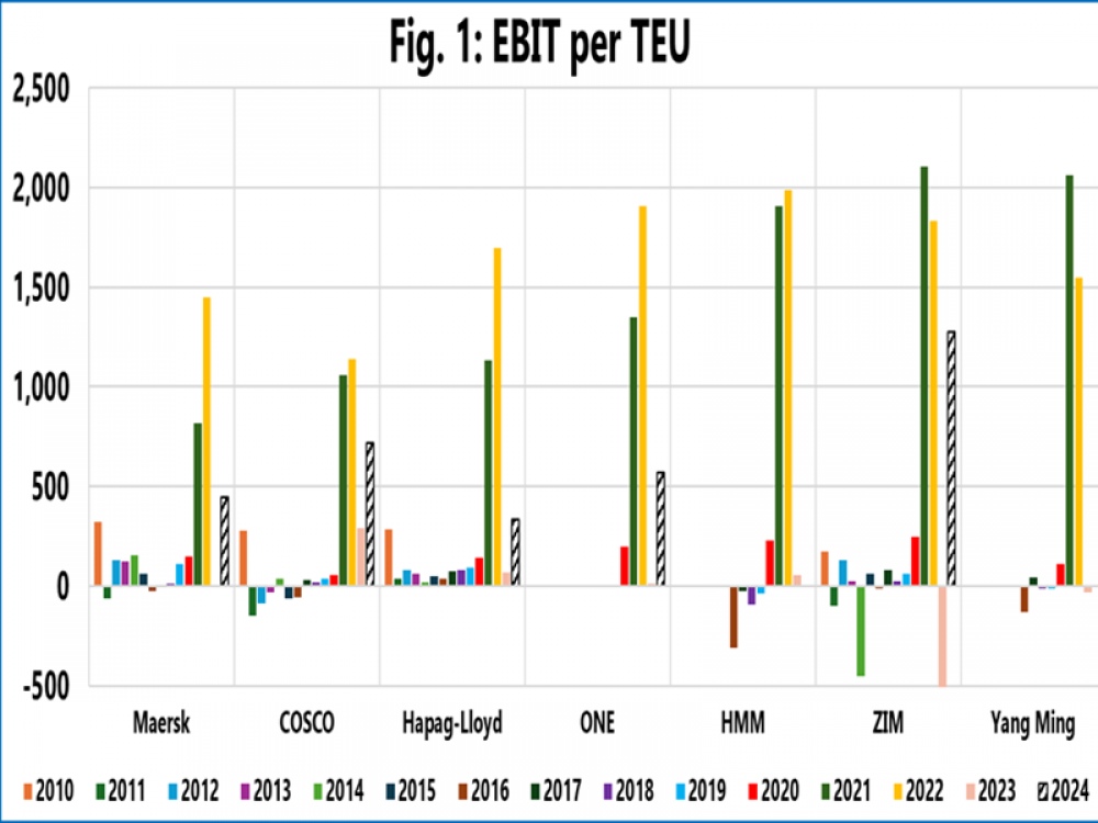 De las nueve aerolíneas que informaron resultados, ocho indicaron un EBIT de más de UJS$1.000 millones, de las cuales tres señalaron un EBIT de más de US$2000 millones. Cosco tuvo el EBIT más alto en el tercer trimestre de 2024, de US$4.710 millones. Incluso con el EBIT más alto, Cosco no tuvo el EBIT/TEU más alto, ya que también aumentó sus volúmenes globales en un 10,8%. Su EBIT/TEU de US$716/TEU fue superado por ZIM con US$1.273/TEU. Tras de Cosco siguieron ONE (US$567/TEU) y Maersk (US$446/TEU).