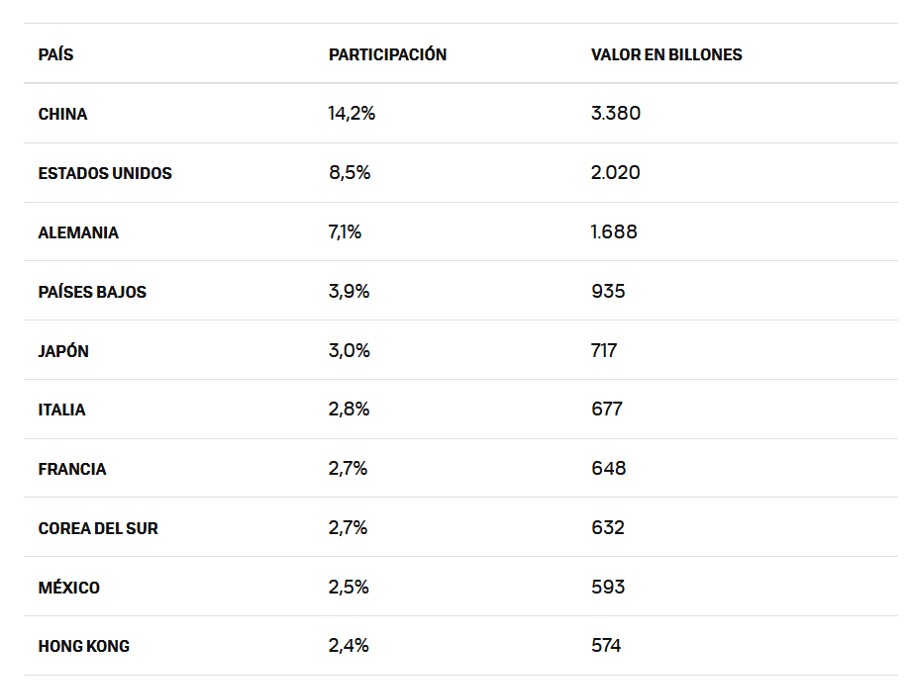 El TOP 10. Aunque el gráfico es muy ilustrativo, vale la pena profundizar un poco más en los principales países exportadores, no sólo para ver tanto el peso de cada uno en las exportaciones a nivel mundial, sino para poner en perspectiva el valor de esas exportaciones: