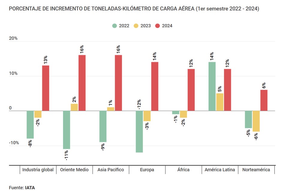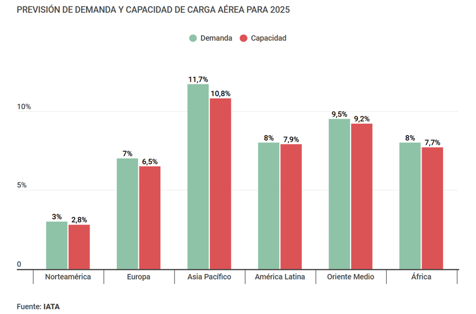 En términos de carga aérea por toneladas-kilómetro en el primer semestre de 2024 con respecto al mismo periodo de los años 2023 y 2022, las dos regiones que más crecieron fueron Oriente Medio y Asia-Pacífico, ambas con el 16% de incremento. Europa fue la tercera, con el 14%, mientras que África y América Latina cerraron esos seis primeros meses del año con el 12% más de toneladas-kilómetro. Las aerolíneas norteamericanas sólo registraron el 6% más. De media, el sector de carga aérea mundial obtuvo un incremento del 13% de enero a septiembre de este año frente a las contracciones del 8% en 2022 y del 2% en 2023. Por su parte, la previsión de expansión del tráfico de carga aérea se apoya en todas las regiones, con tasas de crecimiento interanual que oscilan entre el 6% y el 16%, según los datos del balance anual de IATA y los datos de expectativas para 2025.