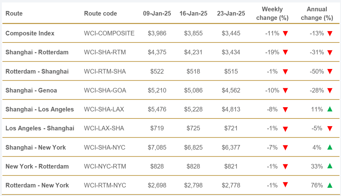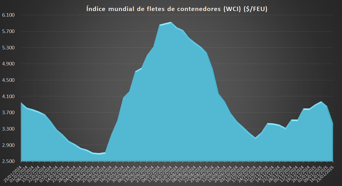 Por su parte, el World Container Index (WCI), que evalúa el coste de los fletes en la principales rutas interoceánicas, se sitúa en 3.445 USD/TEU por contenedor de 40 pies, lo que supone una bajada del 10,6% en relación a la semana anterior. El flete es un 13% inferior al mismo periodo del año pasado, y un 143% más alto respecto al promedio de 2019 (antes de la pandemia) situado en 1.420 USD/TEU.