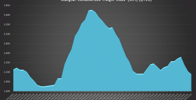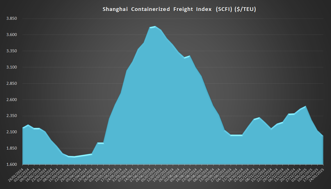 Con un valor de 2.045,45 USD/TEU, los fletes desde Shanghái (SCFI) descienden un 4,01% respecto a la semana anterior. El flete es ya un 6% más bajo que en el mismo periodo de 2024 , pero un 152% más alto que el promedio de 2019 (antes de la pandemia), situado en 811 USD.
