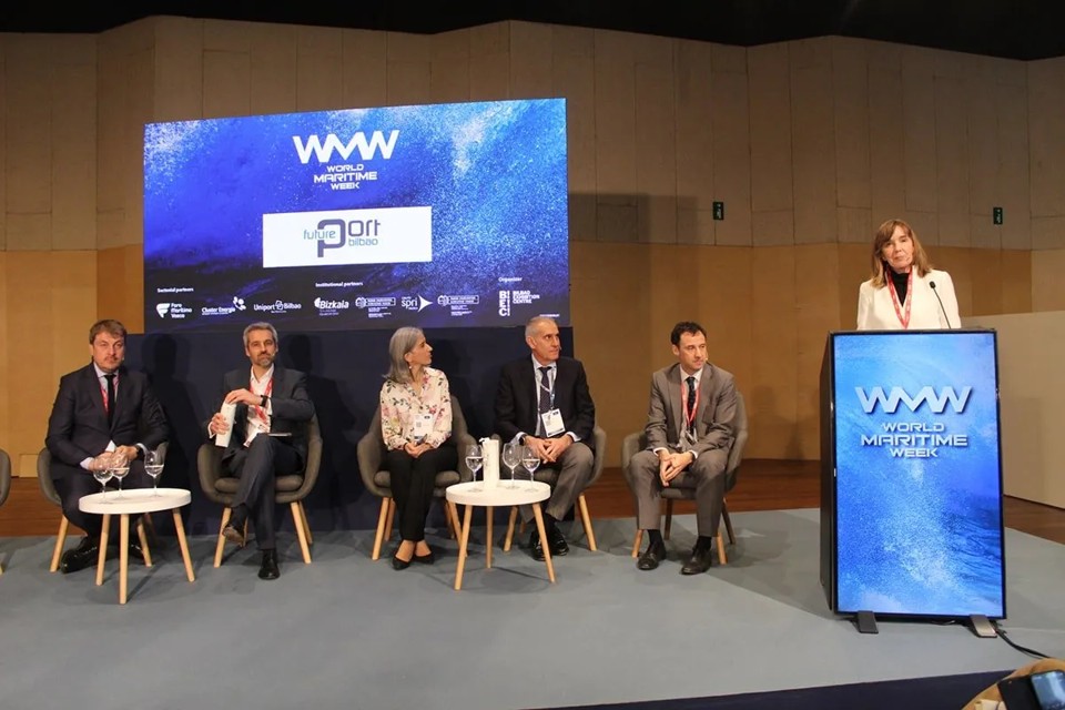 La segunda jornada de sostenibilidad y descarbonización en el ámbito marítimo fue introducida por Natividad Rodríguez, directora general de UniportBilbao, quien dio paso a la mesa compuesta por Federico Navarro y Miguel Juan Núñez, de la DGMM; Maruxa Heras, de Global Factor; Jorge Roca, de Vinci Energies; y Roberto Castilla, de Brittany Ferries.