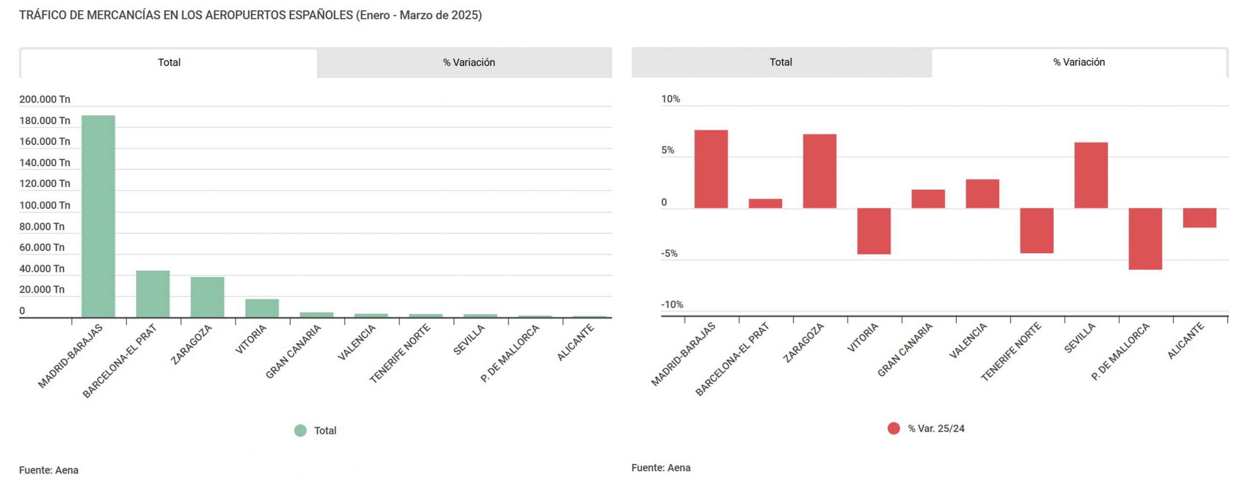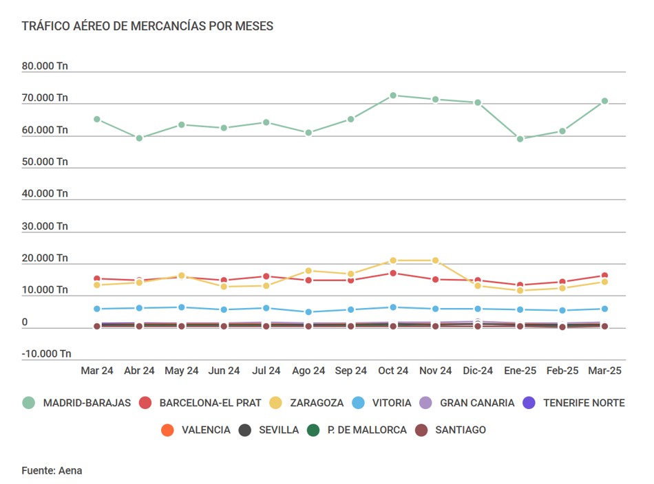 En el caso del principal recinto aeroportuario de España en carga, Madrid-Barajas, se han movido 70.919 toneladas de carga en marzo de 2025, el 8,8% más que en el mismo mes de 2024, cifra que supone “el mes de marzo con más tráfico de mercancía comercial de la historia de la infraestructura madrileña”, según detalla Aena. Le sigue Barcelona-El Prat con 16.359 toneladas, lo que representa un aumento del 6,6% en comparación con el ejercicio anterior, y también alcanza su récord histórico de mercancías en este mes. En tercer lugar, se sitúa Zaragoza con 14.225 toneladas y un incremento del 6,2% respecto al mismo mes de 2024. Por su parte, Vitoria se sitúa en cuarta posición con 5.974 toneladas, lo que implica un crecimiento del 2,2% en comparación a marzo del año pasado.