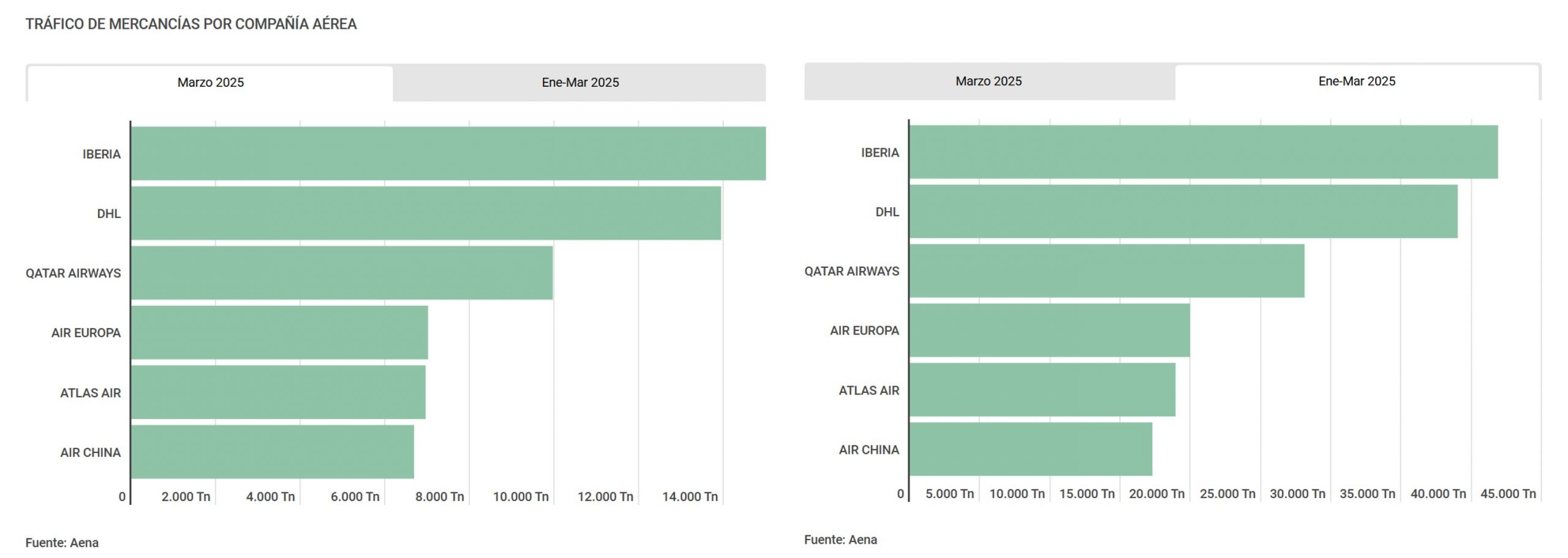 En cuanto a la gestión de mercancía aérea por compañía, Iberia vuelve a liderar el tráfico en los aeropuertos españoles durante marzo de 2025, con un total de 15.360 toneladas movidas. Le sigue DHL, que ha alcanzado las 13.941 toneladas. En tercera posición se sitúa Qatar Airways, con 9.962 toneladas gestionadas, mientras que Air Europa ocupa el cuarto lugar con un volumen de 7.012 toneladas. En la parte baja del ranking, Atlas Air se ha mantenido por delante de Air China con 6.954 toneladas frente a las 6.682 de la aerolínea asiática.