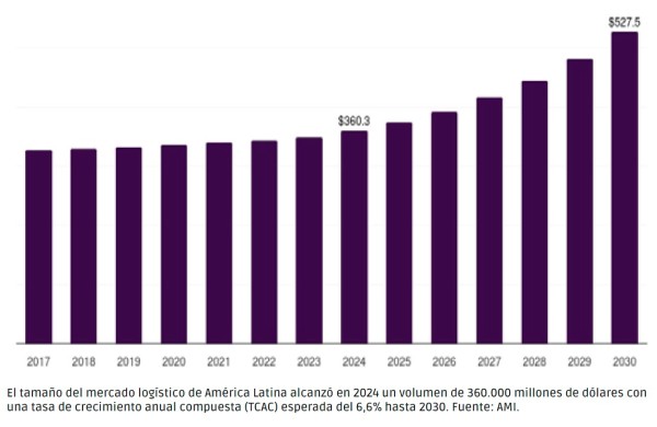 Según el último informe de America’s Market Intelligence (AMI), en 2024, el tamaño del mercado logístico de América Latina alcanzó un volumen de 360.000 millones de dólares con una tasa de crecimiento anual compuesta (TCAC) esperada del 6,6% hasta 2030.