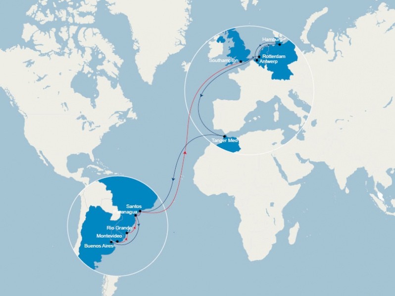 El itinerario será el siguiente: Southampton – Róterdam – Hamburgo – Amberes – Tanger Med – Santos – Paranagua – Buenos Aires – Montevideo – Rio Grande – Paranagua – Santos – Southampton