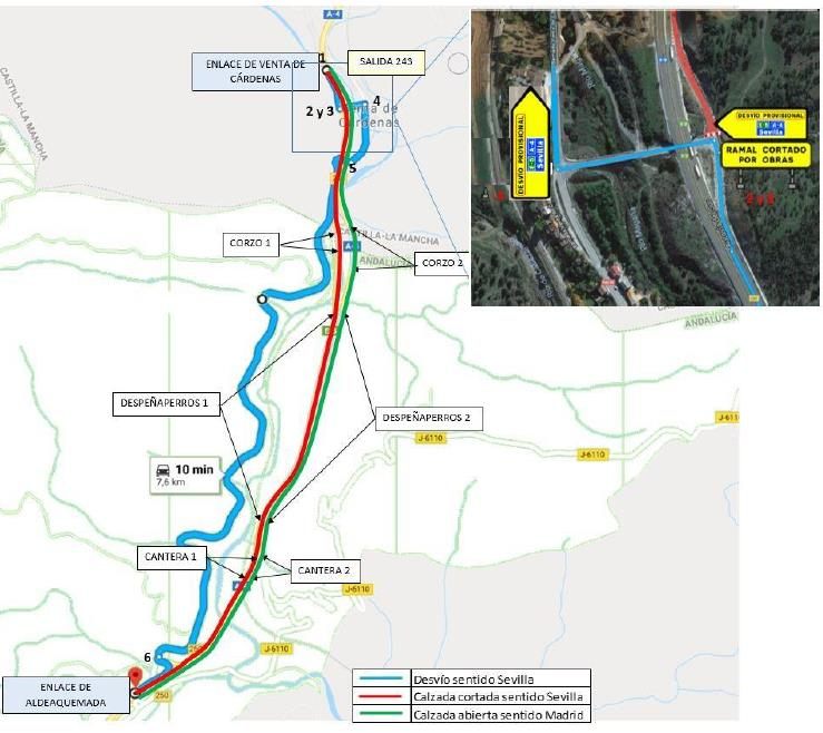 Sentido Sevilla: Desvío por la Salida 243 (Venta Cárdenas), con reincorporación en el km 250,600.