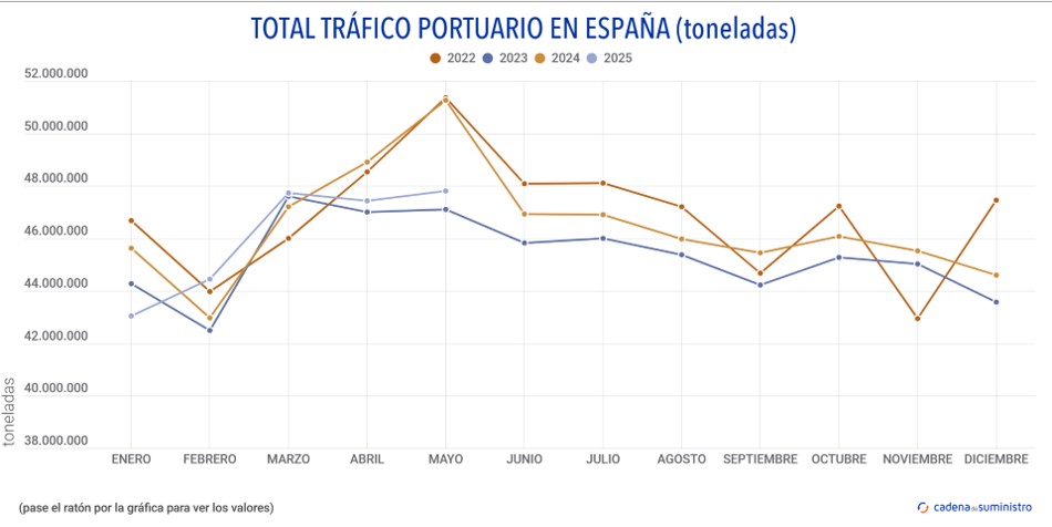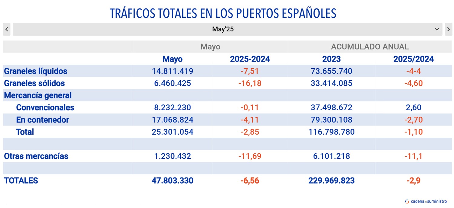 Además, el sistema portuario también registra un tráfico de mercancía general de 25.301.054 toneladas en el período, con un descenso con respecto al mismo mes de 2024 de un 2,85%.