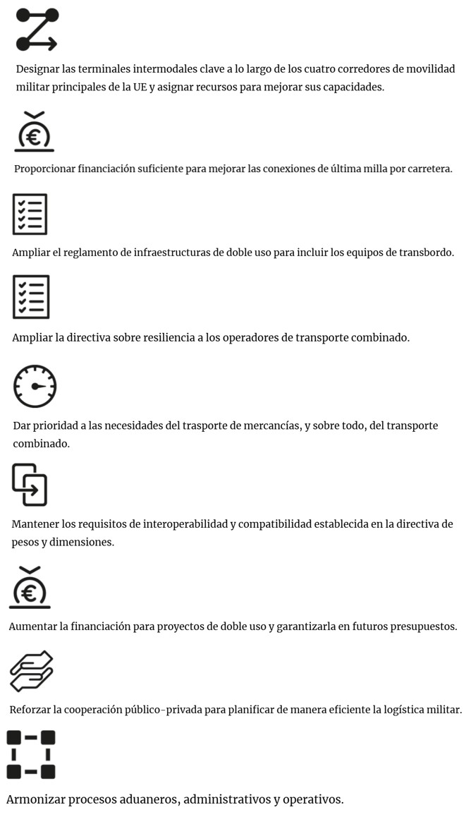 Según los datos de la unión internacional de transporte combinado, la red de este tipo de transporte existente en Europa conecta un millar de terminales con 500 salidas diarias de trenes y cuenta con 10.000 vagones planos intermodales y otros 4.000 vagones pocket optimizados para el transporte de vehículos con ruedas de goma o equipos militares con orugas. La red paneuropea moviliza más de 500 trenes de mercancías intermodales diarios y existen 30 operadores de transporte combinado asociados a la UIRR en toda Europa que facilitan la organización de trenes de transporte militar transfronterizo ad hoc con poca antelación. «El transporte combinado, como columna vertebral del sistema de transporte europeo, ofrece el medio más eficaz para facilitar el transporte militar de cargas pesadas por ferrocarril, lo que permite preservar la infraestructura viaria del desgaste y el deterioro», valora el director general de la UIRR, Ralf-Charley Schultze, en el documento de su organización.