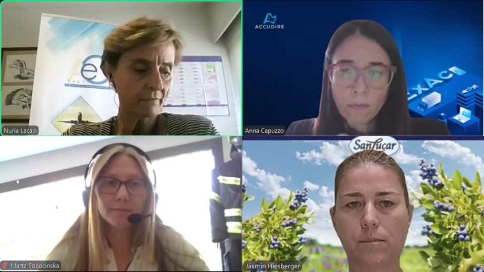Nuria Lacaci, secretaria general de la Asociación de Cargadores de España (ACE); Anna Capuzzo, marketing communication manager en ACCUDIRE; Marta Sobocińska, ingeniera química en Marina Textil; y Jasmin Hiesberger, distribution manager en SanLucar Company, durante el webinar sobre digitalización documental en la cadena logística.