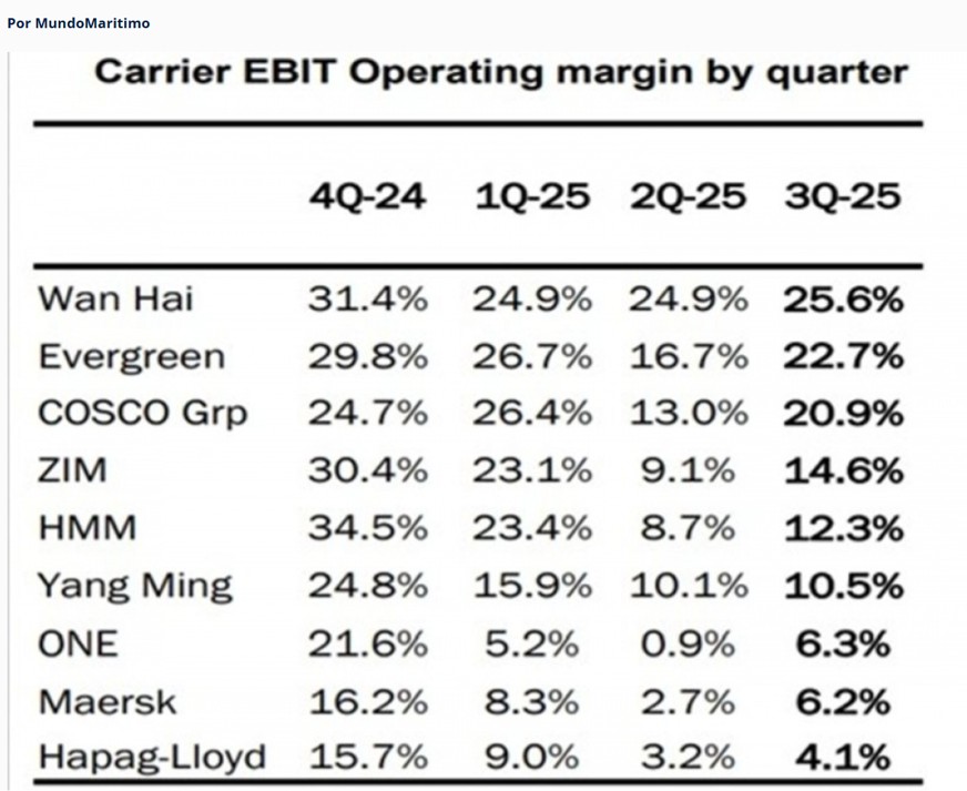 El transporte marítimo de contenedores registró en el tercer trimestre “el mayor volumen trimestral de carga jamás visto”, en un contexto donde los embarcadores adelantaron embarques para evitar plazos de aranceles y gravámenes portuarios. Este repunte se reflejó directamente en las utilidades: el margen operativo promedio de las principales líneas navieras volvió a subir, alcanzando 13,7%, frente al 9,9% del trimestre anterior.