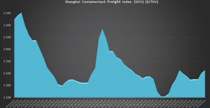 Con un valor de 1.552,92 USD/TEU, los fletes desde Shanghái (SCFI) suben un 3,08% respecto a la semana anterior. El flete es un 35% inferior al mismo periodo de 2024.