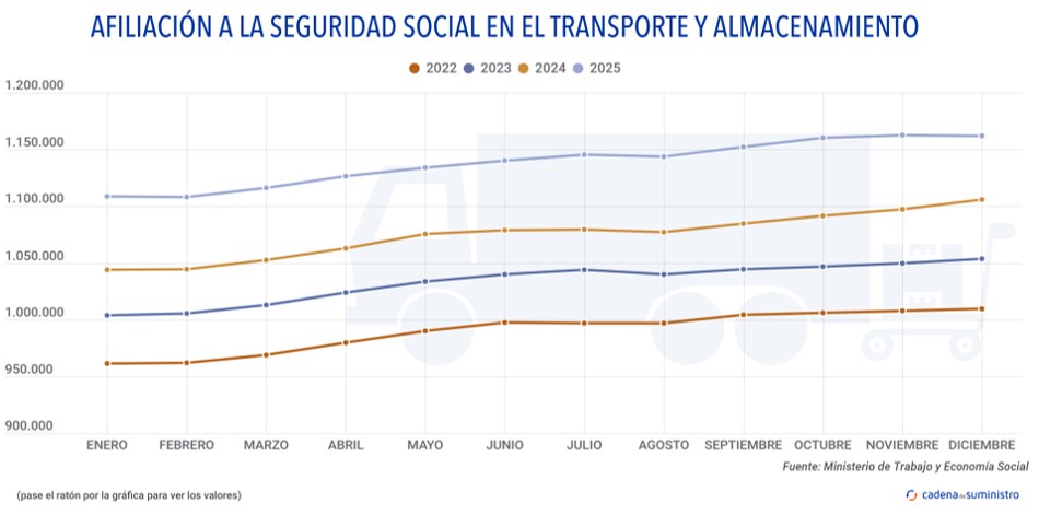El volumen de afiliados a la Seguridad Social en el segmento de transporte y almacenamiento ha terminado 2025 con una ligera tendencia a la baja.