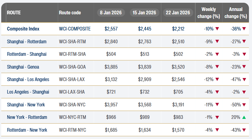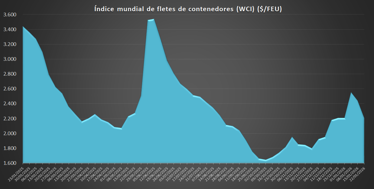 Por su parte, el World Container Index (WCI), que evalúa el coste de los fletes en la principales rutas interoceánicas, se sitúa en 2.212 USD/FEU, lo que supone un descenso del 9,53% respecto a la semana anterior y del 36% respecto al mismo periodo del año pasado.