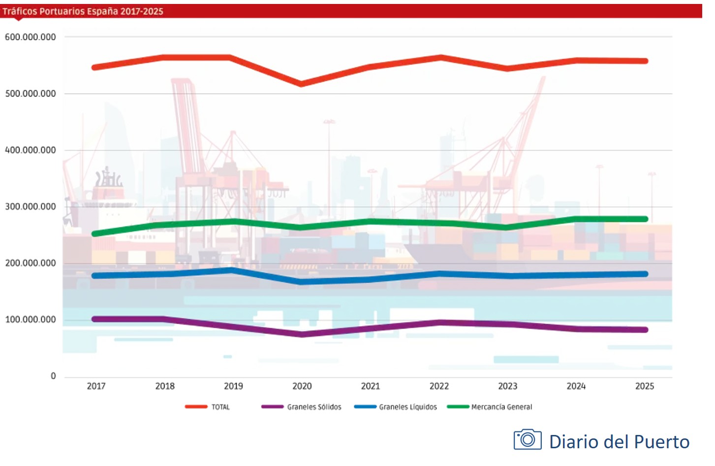 En concreto en 2021 los tráficos ya estaban en 544,41 millones de toneladas y en 2022 prácticamente se rozó el récord con 561,73 millones, pero nada más que eso, se rozó, pues 2023 fue un año a todas luces negativo con una caída hasta los 543,6 millones, mientras la recuperación de 2024 hasta los 557,75 millones ha quedado frenada en 2025. Como se ha señalado, el tráfico total anunciado ayer por Puertos del Estado sitúa las toneladas movidas el año pasado en 556,58 millones, un 0,2% menos que el ejercicio anterior y un 1,4% menos que en 2019, dibujándose una gráfica prácticamente plana en lo que es la evolución de los tráficos en los últimos años, lo que no implica un comportamiento homogéneo si se analiza cada tráfico.