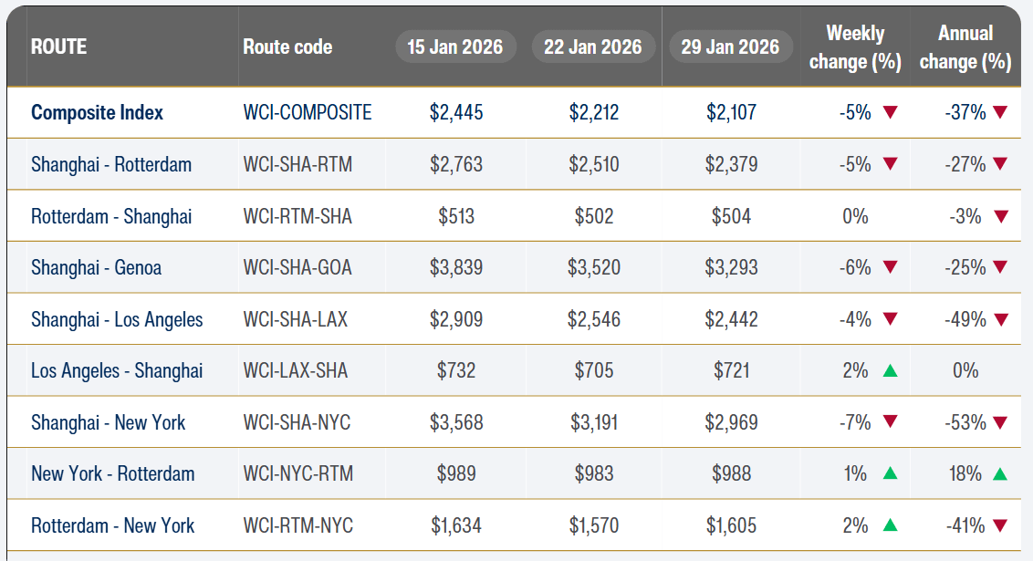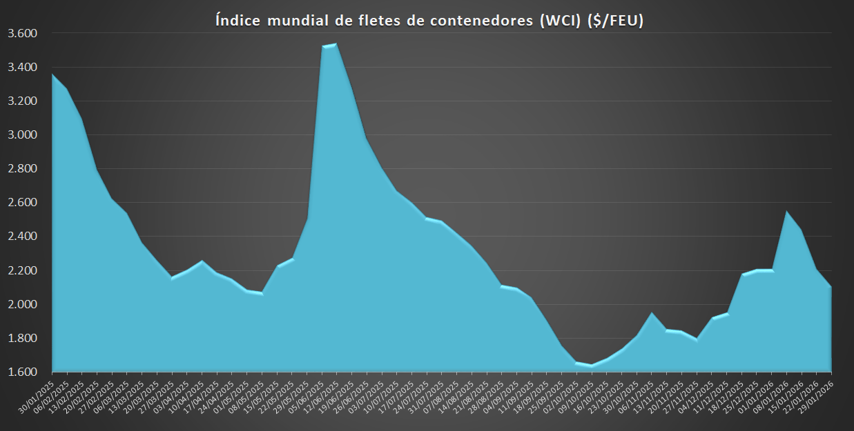 Por su parte, el World Container Index (WCI), que evalúa el coste de los fletes en la principales rutas interoceánicas, se sitúa en 2.107 USD/FEU, lo que supone un descenso del 4,75% respecto a la semana anterior y del 37% respecto al mismo periodo del año pasado.