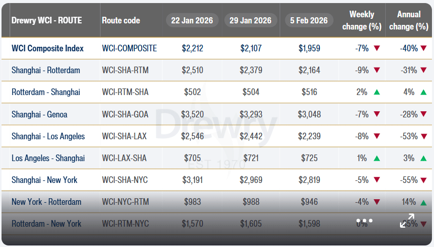 Por su parte, el World Container Index (WCI), que evalúa el coste de los fletes en la principales rutas interoceánicas, se sitúa en 1.959 USD/FEU, lo que supone un descenso del 7,02% respecto a la semana anterior y del 40% respecto al mismo periodo del año pasado.