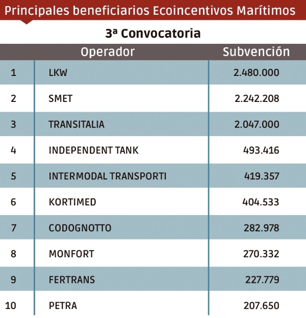 Los operadores que más ayudas han recibido en esta convocatoria han sido LKW, SMET y Transitalia, con 2,48, 2,24 y 2,04 millones de euros respectivamente.