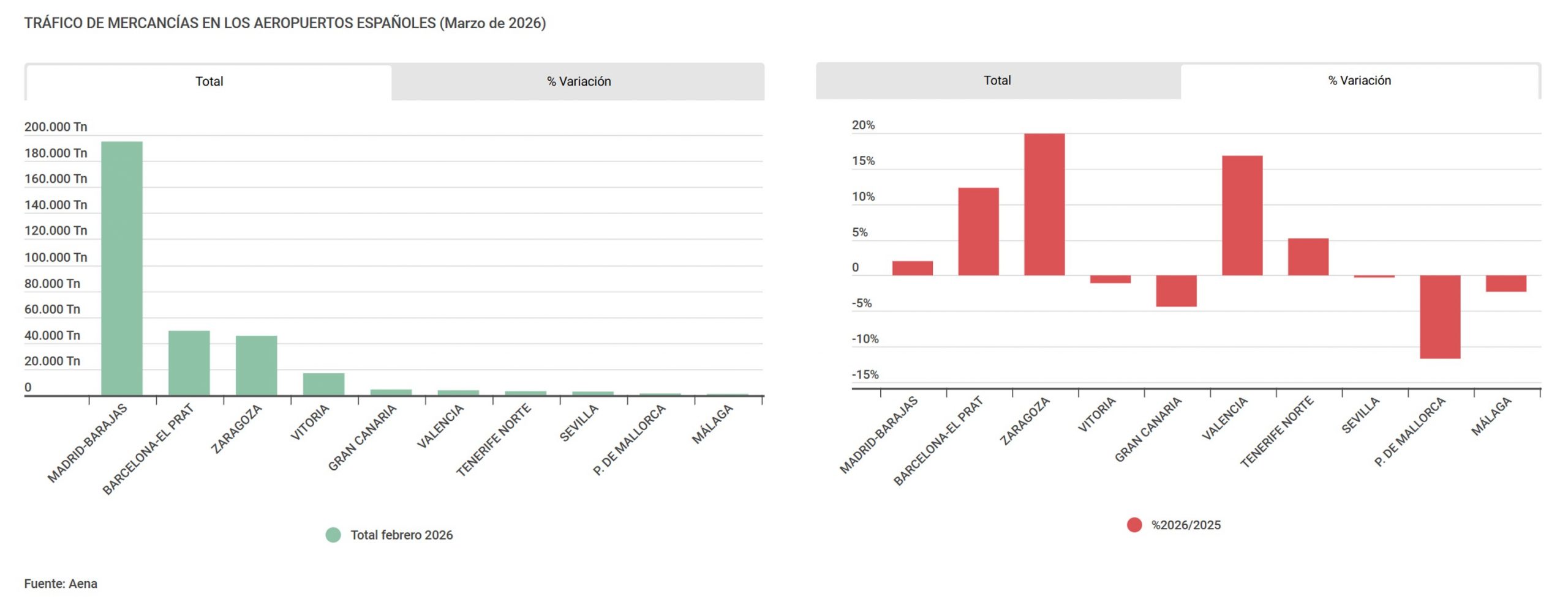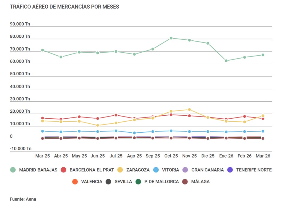 Un mes más, Madrid-Barajas se mantiene como el principal nodo de carga aérea en España tras mover 67.133 toneladas de mercancía, aunque en esta ocasión registra una contracción del 5,3% respecto al mismo mes de 2025. En segundo lugar, Zaragoza ha relevado a Barcelona-El Prat tras alcanzar 18.430 toneladas y registrar un crecimiento del 29,6% con un nuevo récord mensual. Por su parte, la infraestructura catalana pasa al tercer lugar con 16.128 toneladas, lo que supone un descenso del 1,4% interanual. A continuación se sitúan Vitoria, con 5.866 toneladas (-1,8%), y Gran Canaria, que ha contabilizado 1.461 toneladas, el 9,6% menos. En el lado positivo, Valencia ha registrado un incremento del 10,1% hasta alcanzar 1.211 toneladas, seguida de Sevilla, con 1.079 toneladas (+7,5%), y Tenerife Norte-Ciudad de La Laguna, que ha movido 1.002 toneladas, el 1,6% más que en marzo del año anterior.