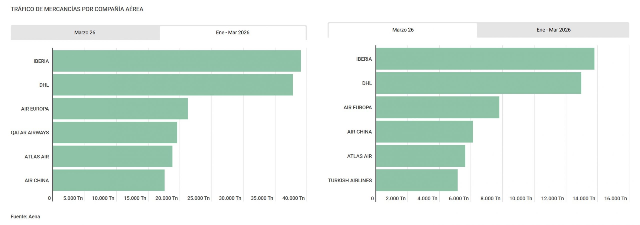 En el desglose de transporte de mercancías por compañía aérea, Iberia se mantiene como el principal operador en marzo tras gestionar 13.796 toneladas. A continuación se sitúa DHL, con 12.963 toneladas, consolidando la segunda posición, mientras que Air Europa asciende al tercer puesto con 7.783 toneladas. Por su parte, Air China y Atlas Air ocupan la cuarta y quinta posición con 6.114 y 5.628 toneladas, respectivamente. En este contexto, destaca la salida de Qatar Airways del top 5 —tras haberse situado entre las tres primeras en febrero—, mientras que Turkish Airlines entra en la clasificación en sexta posición con 5.150 toneladas.
