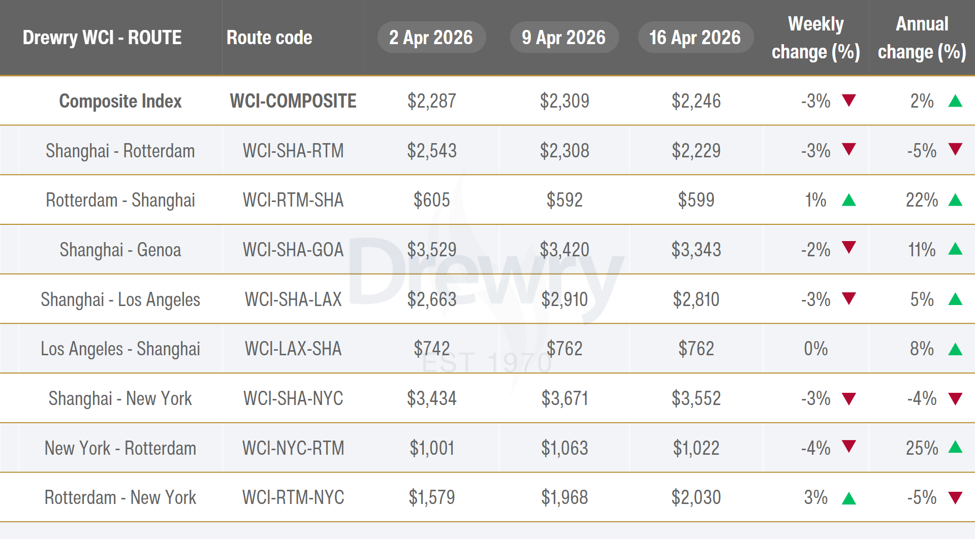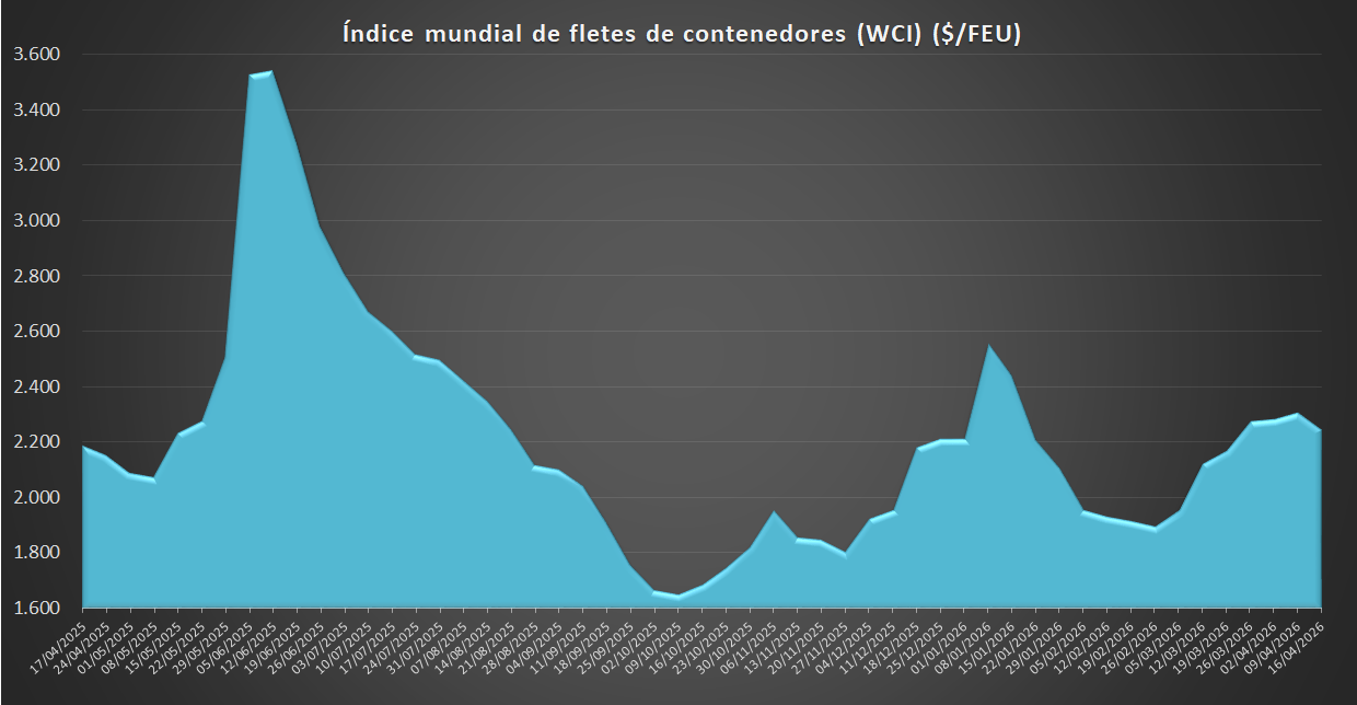 Por su parte, el World Container Index (WCI), que evalúa el coste de los fletes en la principales rutas interoceánicas, se sitúa en 2.246 USD/FEU, lo que supone un descenso del 2,73% respecto a la semana anterior y un incremento del 2% respecto al mismo periodo del año pasado.