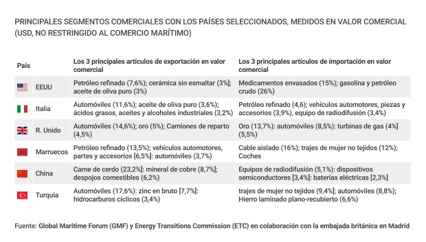 El análisis de GMF y ETC, dos organizaciones internacionales en las que participan multinacionales de diferentes actividades industriales, subraya que “el continente europeo ofrece muchas oportunidades de asociación bilateral para España, especialmente con Reino Unido e Italia, ya que hay un buen equilibrio entre el impacto y la viabilidad” para impulsar corredores marítimos verdes. El comercio con ambos países se caracteriza por una alta proporción de bienes de alto valor en el segmento de la carga general (tanto en contenedor como no contenerizada), como en productos alimenticios y automóviles.