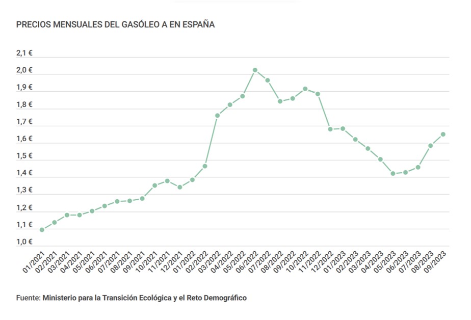 En el contexto actual, la secretaria general de la Asociación de Cargadores de España (ACE), Nuria Lacaci, reconoce que las bonificaciones “vuelven a ser necesarias porque estamos en una nueva escalada del combustible”. En septiembre de 2023, el precio del gasóleo para automoción está en 1,65€, según los datos del Ministerio de Transición Ecológica y Reto Demográfico, tan solo diez céntimos por debajo de la de marzo de 2022. Si bien es cierto que no se han alcanzado los precios de junio del año pasado (por encima de los dos euros el litro), sí que se aproximan a la media de diciembre de 2022 (1,68€ por litro). También están muy lejos de la media de 2021 cuando el precio por litro se situaba entre los 1,2 y los 1,3 euros, cifras que no se han vuelto a alcanzar en estos dos años. Además, la tendencia continúa siendo alcista, tal y como vaticinó el CNTC y señaló recientemente la Federación Valenciana de Empresarios del Transporte y la Logística (FVET). “Se prevé que el precio siga incrementando en los próximos meses”, alertaron.