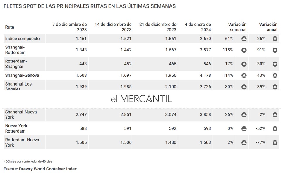El transporte marítimo de contenedores está inmerso en una espiral alcista de fletes spot con la crisis del Mar Rojo como principal vector. Según los últimos datos del Índice Mundial de Contenedores de la consultora británica Drewry, publicados este jueves, los precios spot han aumentado el 61% en el transcurso de apenas una semana, hasta los 2.670 dólares por contenedor de 40 pies. La cifra también está el 25% por encima de la experimentada en la misma semana de 2022. Además, el flete está ahora el 88% por encima de las tarifas medias prepandemia, que eran del orden de 1.420 dólares, han recordado desde Drewry. En este contexto y ante la persistencia de la crisis en el Mar Rojo, los analistas prevén que los fletes entre Asia y Europa mantengan la escalada en las próximas semanas, especialmente en las rutas con el Mediterráneo, que serán, de lejos, las más afectadas por el incremento de la distancia motivada por el desvío por el Cabo de Buena Esperanza.