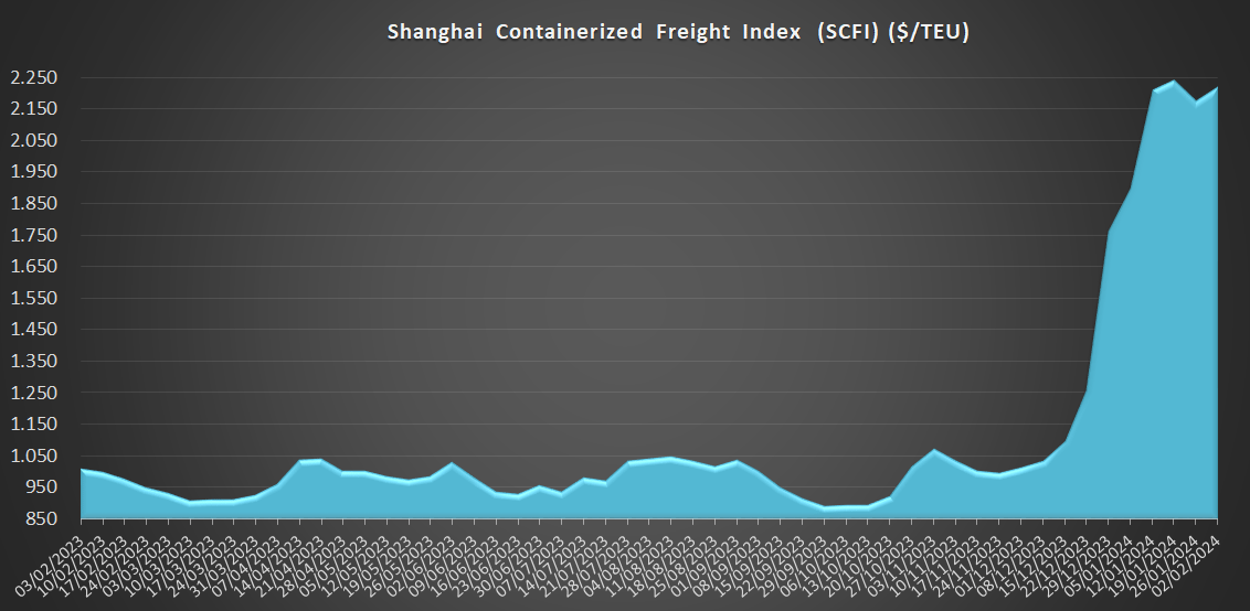 02/02/2024 ACE Con un valor de 2.218 USD/TEU, los fletes desde Shanghái (SCFI) reflejan hoy un […]