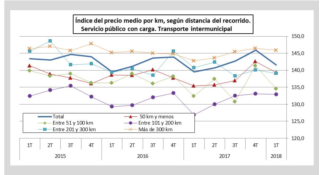 Según recoge la estadística que elabora el Ministerio de Fomento, el precio del transporte ha bajado un -2,95 % en el primer trimestre de 2018, con respecto al trimestre anterior. El mayor descenso en el precio se corresponde con los viajes comprendidos entre 51 km y 100 km (-4,81 %), mientras que el menor se encuentra en las distancias entre 101 km y 200 km (-0,15 %).
