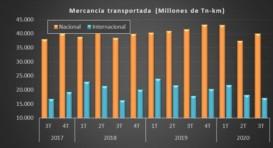 27/11/2020 ACE Según recoge la última encuesta permanente del transporte de mercancías por carretera que elabora el Ministerio de Fomento, en el tercer trimestre de 2020 se han transportado un total de 57.152 millones de toneladas-kilómetro, un 3,65% menos respecto al mismo periodo de 2019 (59.358 millones de toneladas-kilómetro).