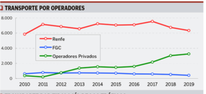 17/12/2020 TRANSPORTE XXI Pasan de tener un peso del 5,4 por ciento en 2010 a representar el 32,5% en 2019, mientras la pública Renfe reduce su participación en 22,1 puntos, hasta el 63,5%, durante este periodo.