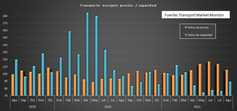 07/09/2021 ACE Según publica Transport Market Monitor, los precios y la capacidad de carga del transporte de mercancías en Europa, en el mes de agosto de 2021, han tenido la siguiente evolución: