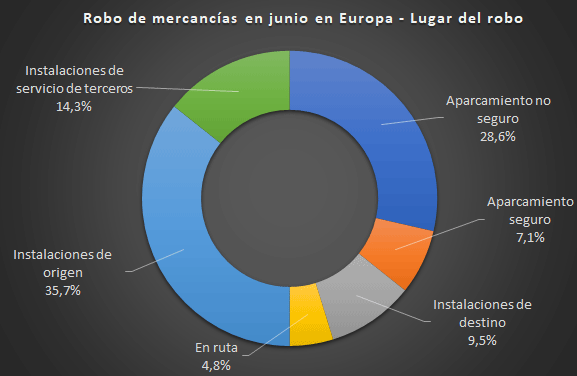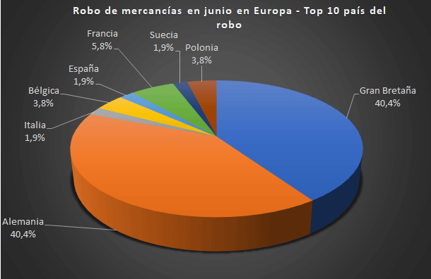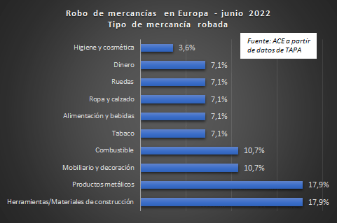 Según las estadísticas elaboradas por ACE a partir de los datos extraídos de la Asociación para la Protección de Activos Transportados (TAPA), durante el mes de junio de 2022, el 7% de los robos a camiones en Europa se produjeron en aparcamientos seguros. Las herramientas y materiales de construcción, junto con los suministros metálicos, se constituyen como las mercancías más robadas, con un 36% del total. En cuanto a países, más del 80% de los robos se han perpetrado en Reino Unido y Alemania.