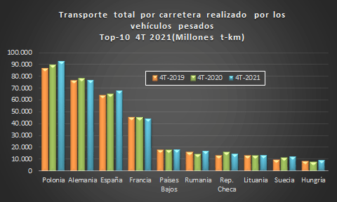 Al cierre del ejercicio 2021, Polonia continúa a la cabeza del transporte por carretera en Europa, con un mercado mayoritariamente internacional. Le sigue Alemania que, por el contrario, se concentra en el mercado doméstico y el tercero es España, que se reparte un 68% nacional y un 32% internacional.