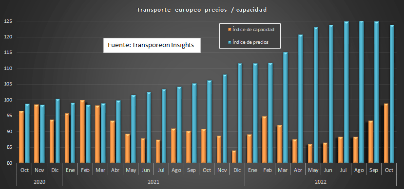 04/11/2022 ACE Según datos de la plataforma Transporeon Insights, los precios y la capacidad de carga del transporte de mercancías en Europa en el mes de octubre de 2022, han tenido la siguiente evolución: