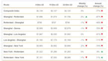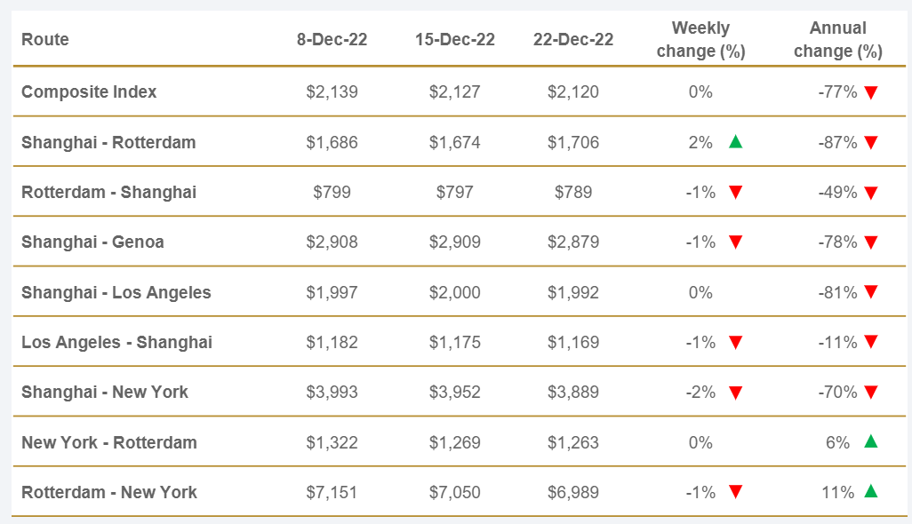 Los fletes comienzan a estabilizarse 23/12/2022 ACE Con un valor de 1.107,09 $/TEU, los fletes desde Shanghái (SCFI) reflejan hoy un descenso del -1,4 % respecto a la semana anterior y del -77,6 % en comparación con el mismo periodo de 2021..