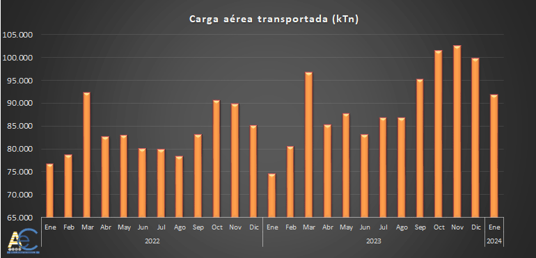 En enero de 2024 se ha producido un incremento del 23,1% en el volumen de carga aérea en los aeropuertos de nuestro país, con respecto al mismo periodo de 2023. Este dato refleja el impacto de la crisis del Mar Rojo, que está provocando el trasvase de mercancía del modo marítimo hacia el modo aéreo.