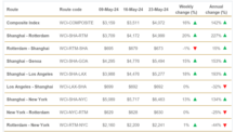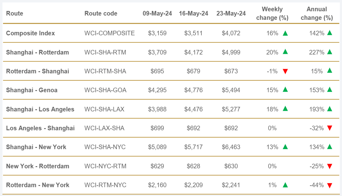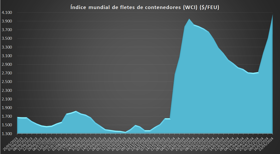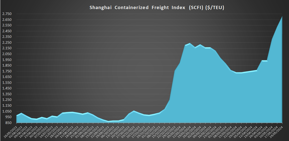 24/05/2024 ACE Con un valor de 2.703,43 USD/TEU, los fletes desde Shanghái (SCFI) reflejan hoy un ascenso del 7,25% respecto a la semana anterior y un incremento del 174% en comparación con el mismo periodo de 2023. El índice es un 233% más alto que el promedio de 2019 (antes de la pandemia), situado en 811 USD.
