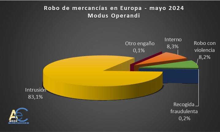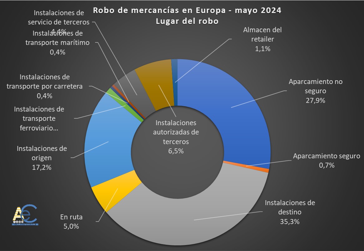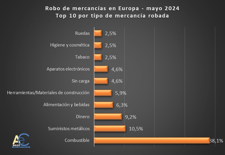 Según la estadística elaborada por ACE a partir de datos del mes de mayo, extraídos de la Asociación para la Protección de Activos Transportados (TAPA), la mercancía más sustraída sigue siendo el combustible del vehículo (38,1%), seguido de los suministros metálicos/cobre (10,5%). Alemania encabeza el ranking de países con más delitos de robo de mercancía (26,3%), seguido de Reino Unido (20,6%) y Francia (16,7%). La mayoría de los robos se llevaron a cabo en las instalaciones de destino (35,3%), ocupando el segundo lugar los aparcamientos no seguros (27,9%), y más de un 8% de los robos se realizó con violencia hacia el conductor. El crecimiento de la intermodalidad se refleja en un incremento de los robos en las instalaciones de paso.