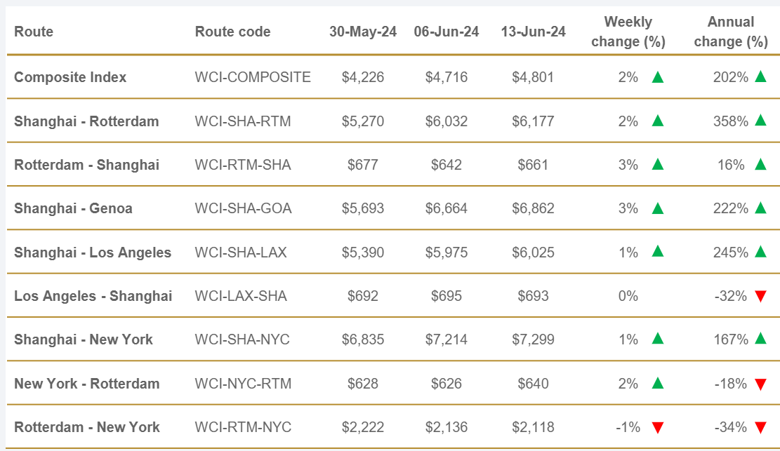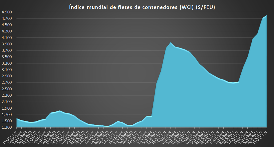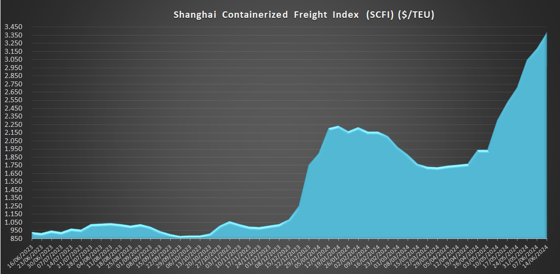 14/06/2024 ACE Con un valor de 3.379,22 USD/TEU, los fletes desde Shanghái (SCFI) reflejan hoy un ascenso del 6,1% respecto a la semana anterior y un incremento del 262% en comparación con el mismo periodo de 2023. El índice es un 316% más alto que el promedio de 2019 (antes de la pandemia), situado en 811 USD.