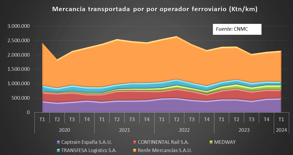 Según recoge el último informe de la CNMC, en el primer trimestre de 2024 todos los indicadores de actividad del transporte ferroviario de mercancías han mejorado ligeramente respecto del trimestre anterior. Las t-km han aumentado un 1,2%, los trenes-km un 5,0%, los ingresos un 1,8% y las toneladas netas un 2,7%.