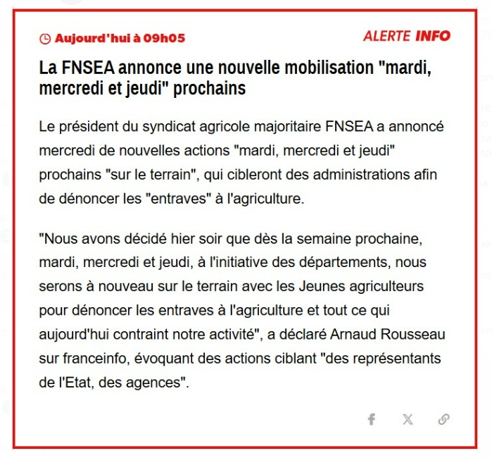 "Anoche decidimos que a partir de la próxima semana, martes, miércoles y jueves, por iniciativa de los departamentos, los Jóvenes Agricultores nos movilizaremos nuevamente para denunciar los obstáculos a la agricultura y todo lo que actualmente limita nuestra actividad", declaró Arnaud Rousseau en franceinfo.