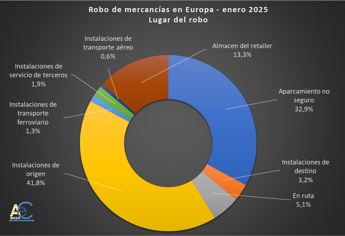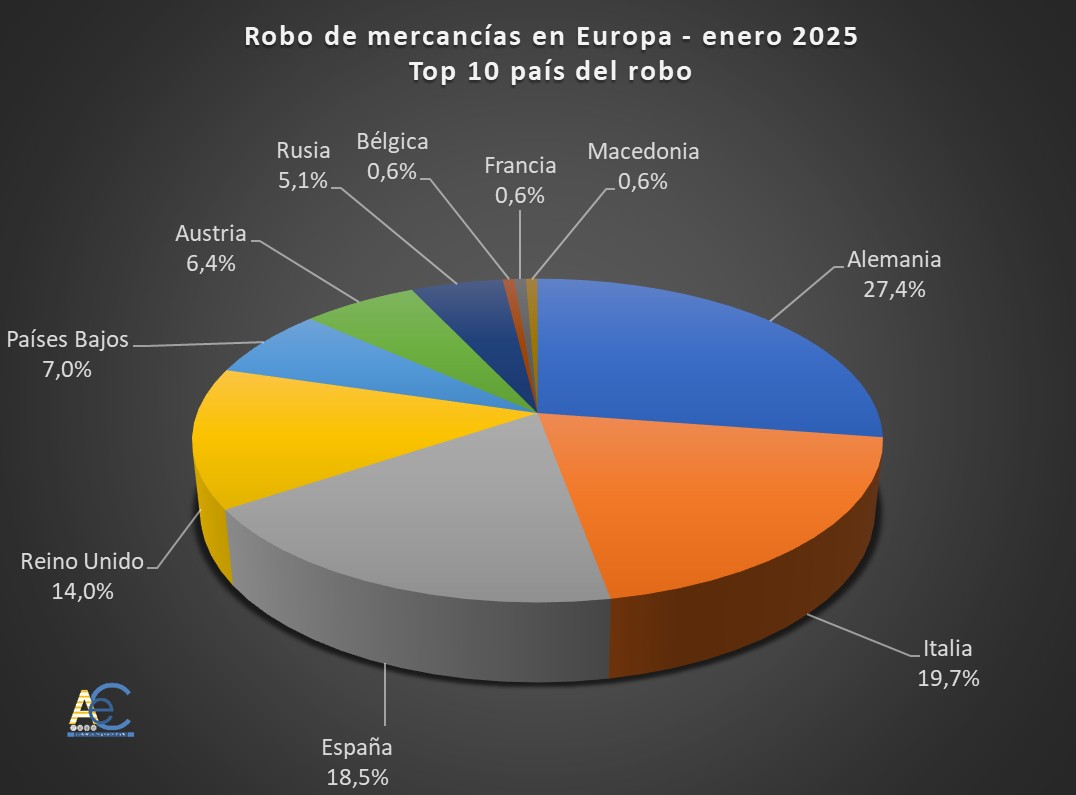 Según la estadística elaborada por ACE a partir de datos del mes de enero extraídos de la Asociación para la Protección de Activos Transportados (TAPA), la mercancía más sustraída en el mes de enero ha sido el cobre (19,2%) seguido del combustible del vehículo (18,3%). Alemania encabeza el ranking de países con más delitos de robo de mercancía (28,7%), seguido de Italia (19,7%) y España (18,5%). La mayoría de los robos se llevaron a cabo en las instalaciones de origen (41,8%), ocupando el segundo lugar los robos en aparcamientos no seguros (32,9%).